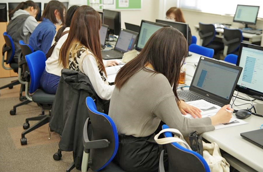 短期大学保育科では図書館協力のもと1年次後期に各ゼミナールごとに、「情報リテラシー教育」を行っています。2年次後期に予定されている「ゼミナール発表会」に向けて、大久保先生のゼミナールでは、「子ども」「おもちゃ」「あそび」をキーワードに1年半学びを深めていきます。実際にパソコンの画面を操作しながら、図書館にどんな本、絵本があるのかを調べる蔵書検索(OPAC)のコツ、新聞社や研究機関がまとめた外部データベースの見方などを体験して、根拠のはっきりとした資料・信憑性の高い資料を収集する方法を学びました。説明を聞きながらうなずいていたり、手元の配布資料の余白にメモを書いていたりと熱心な短大生の姿が印象的でした。